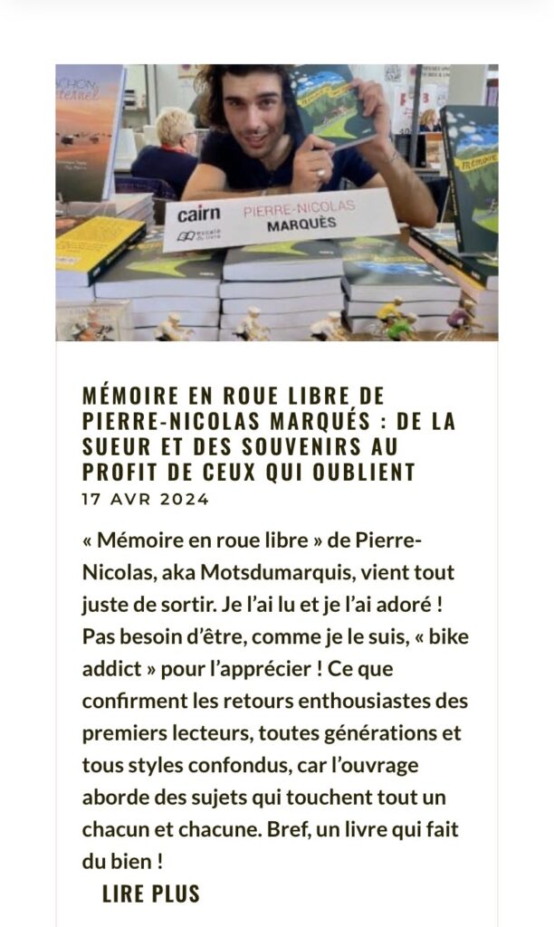 Quand il m’a contactée il y a quelques années, son livre n’existait pas encore. Il était dans sa tête. Nous avons discuté trois heures au téléphone. Puis plein d’autres à pas d’heure. Le vélo nous avait reliés. Les mots nous ont ancrés.
