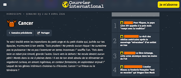 Celui du Courrier International, signé par le très atypique astrologue (auteur et musicien ) américain Rob Brezsny (Cancer comme moi).